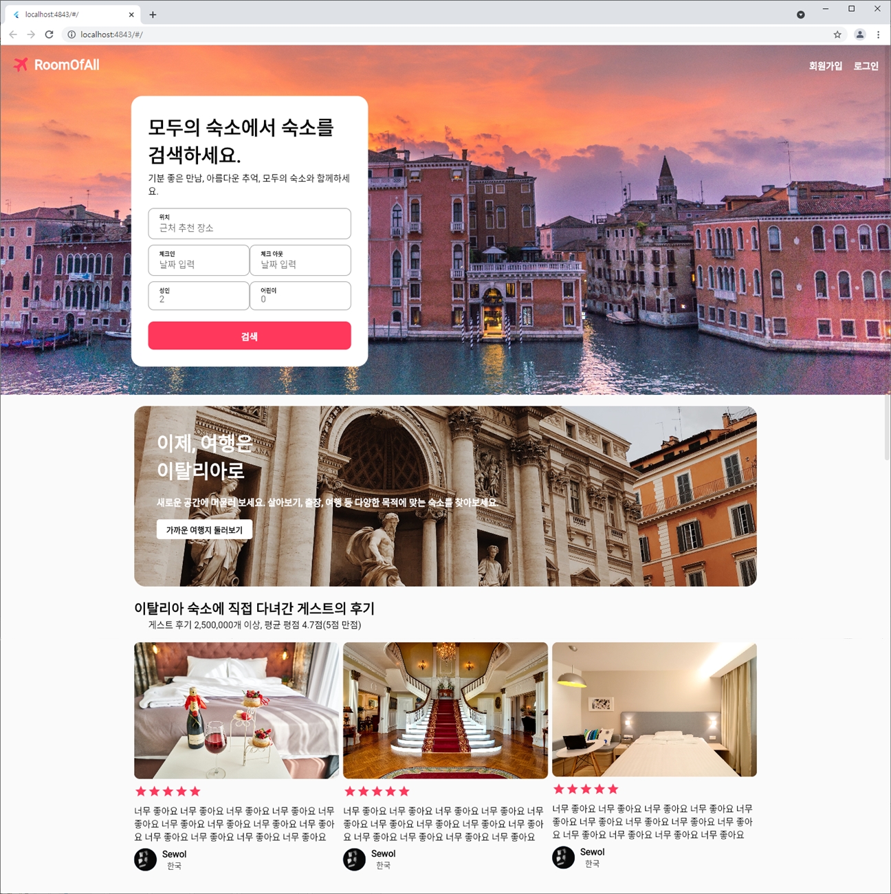 "최주호, 정호준, & 정동진. (2021). 모두가 할 수 있는 플러터 UI 입문. 앤써북"으로 플러터 공부를 하고 있다. 9장에서는 모두의숙소 웹을 만들었다. 플로터로 웹도 만들 수 있다. [그림 1]은 완성된 페이지이다.