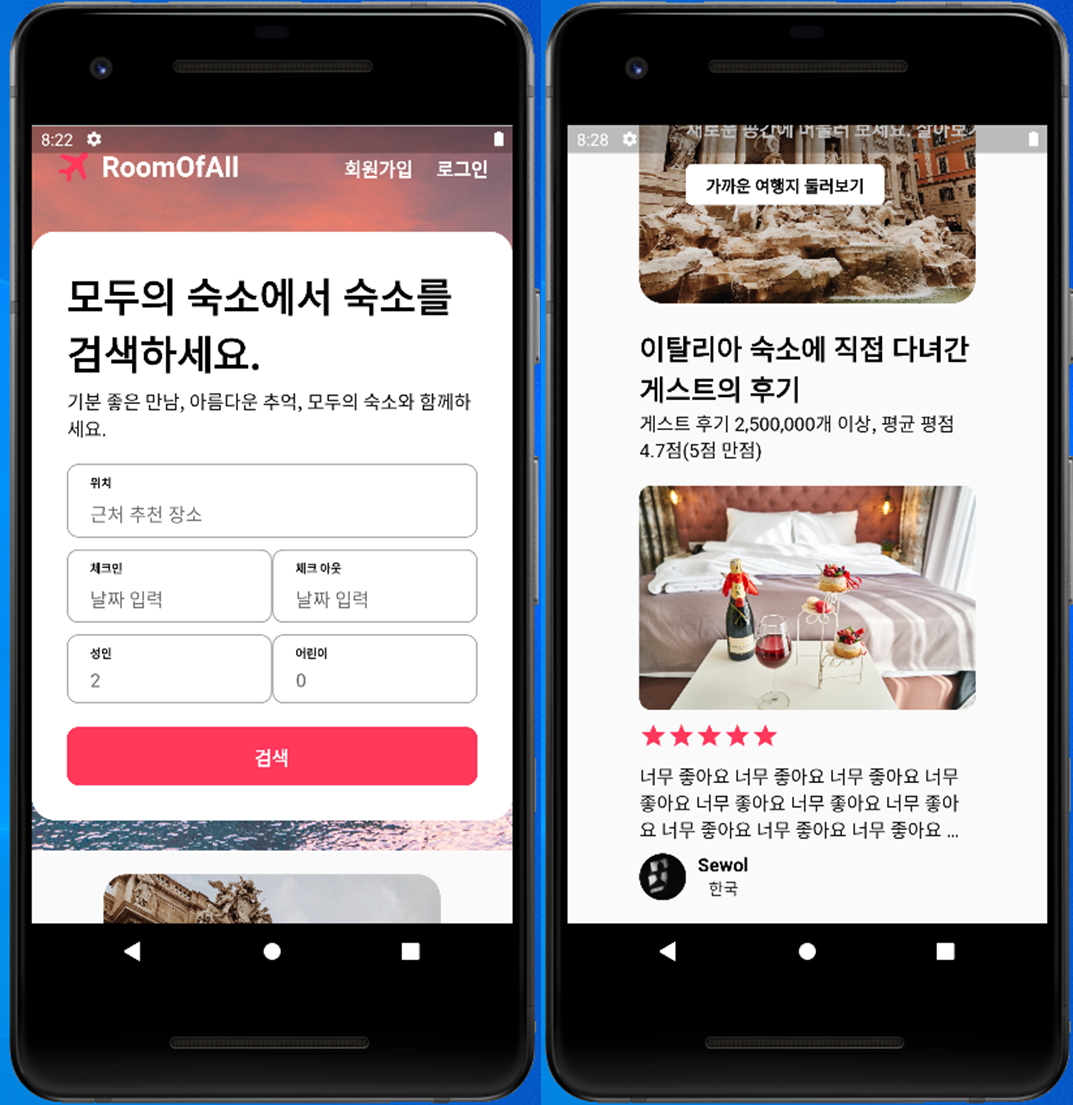 [그림 1] 완성된 모두의숙소 웹 앱으로도 빌드를 시도했는데 [그림 2]와 같은 에러가 발생했다. 최신의 Kotlin Gradle plugin이 필요하다고 한다. 기존에 만들었던 앱 프로젝트를 빌드해봐도 동일한 현상이 발생했기 때문에 이번에 작성한 코드의 문제는 아닌 것으로 보인다. [그림 2]는 VS Code에서 보여주는 에러 메시지이며, 안드로이드 스튜디오에도 역시 빌드되지 않았다. 이렇게 저렇게 만져 보았지만 아직은 해결방법을 찾지 못했다(2022년 02월 09일 해결함).