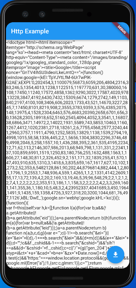 import 'package:flutter/material.dart'; import 'package:http/http.dart' as http; // http 패키지 불러오기 void main() => runApp(MyApp()); class MyApp extends StatelessWidget { @override Widget build(BuildContext context) { return MaterialApp( title: 'Flutter Demo', home: HttpApp(), ); } } class HttpApp extends StatefulWidget { @override State<StatefulWidget> createState() => _HttpApp(); } class _HttpApp extends State<HttpApp> { String result = ''; @override Widget build(BuildContext context) { return Scaffold( appBar: AppBar( title: Text("Http Example"), ), body: Container( child: Center( child: Text('$result'), ), ), floatingActionButton: FloatingActionButton( onPressed: () async { var url = 'http://www.google.com'; var response = await http.get(Uri.parse(url)); // GET 방식으로 URL에 접속하는 코드 setState(() { result = response.body; }); }, child: Icon(Icons.file_download), ), ); } }