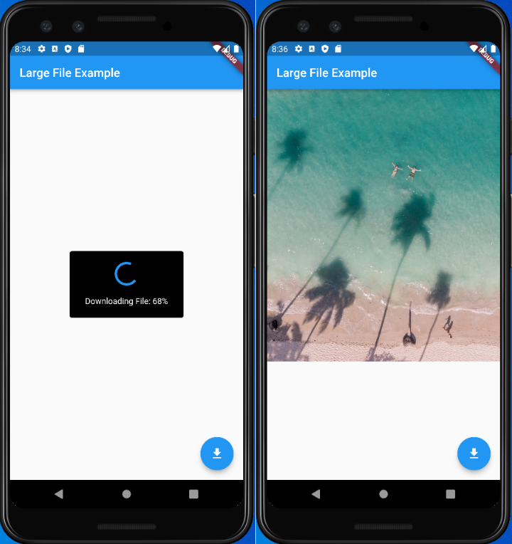 // main.dart import 'package:flutter/material.dart'; import 'largeFileMain.dart'; void main() => runApp(MyApp()); class MyApp extends StatelessWidget { @override Widget build(BuildContext context) { return MaterialApp( home: LargeFileMain(), ); } }// largeFileMain.dart import 'package:file/memory.dart'; import 'package:dio/dio.dart'; import 'package:flutter/cupertino.dart'; import 'package:flutter/material.dart'; import 'package:path_provider/path_provider.dart'; import 'dart:io'; // 파일 입출력을 돕는 io 패키지 class LargeFileMain extends StatefulWidget { @override State<StatefulWidget> createState() => _LargeFileMain(); } class _LargeFileMain extends State<LargeFileMain> { // 내려받을 이미지 주소 final imgUrl = 'https://images.pexels.com/photos/5019409/pexels-photo-5019409.jpeg' '?auto=compress'; bool downloading = false; // 지금 내려받는 중인지 확인하는 변수 var progressString = ""; // 현재 얼마나 내려받았는지 표시하는 변수 String file = ""; // 내려받은 파일 @override Widget build(BuildContext context) { return Scaffold( appBar: AppBar( title: Text('Large File Example'), ), body: Center( child: downloading ? Container( height: 120.0, width: 200.0, child: Card( color: Colors.black, child: Column( mainAxisAlignment: MainAxisAlignment.center, children: <Widget>[ CircularProgressIndicator(), SizedBox( height: 20.0, ), Text( 'Downloading File: $progressString', style: TextStyle( color: Colors.white, ), ), ], ), ), ) : FutureBuilder( builder: (context, snapshot) { switch (snapshot.connectionState) { case ConnectionState .none: // FutureBuilder.future가 null일 때 print('none'); return Text('데이터 없음'); case ConnectionState .waiting: // 연결되기 전(FutureBuilder.future에서 데이터를 반환받지 않았을 때) print('waiting'); return CircularProgressIndicator(); case ConnectionState.active: // 하나 이상의 데이터를 반환받을 때 print('active'); return CircularProgressIndicator(); case ConnectionState.done: // 모든 데이터를 받아서 연결이 끝날 때 print('done'); if (snapshot.hasData) { return snapshot.data as Widget; } } print('end process'); return Text('데이터 없음'); }, future: downloadWidget(file), )), floatingActionButton: FloatingActionButton( onPressed: () { downloadFile(); }, child: Icon(Icons.file_download), ), ); } // downloadWidget은 이미지 파일이 있는지 확인해서 있으면 이미지를 화면에 보여주는 위젯을 반환하고, 없으면 'No Data'라는 텍스트를 출력한다. Future<Widget> downloadWidget(String filePath) async { File file = File(filePath); bool exist = await file.exists(); new FileImage(file).evict(); // 캐시 초기화하기, evict()로 캐시를 비우면 같은 이름이라도 갱신한다. if (exist) { return Center( child: Column( children: <Widget>[Image.file(File(filePath))], ), ); } else { return Text('No Data'); } } Future<void> downloadFile() async { // dio를 선언한 후 내부 디렉터리를 가져온다. Dio dio = Dio(); try { // getApplicationDocumentsDirectory는 path_provider 패키지가 제공하며 플러터 앱의 내부 디렉터리를 가져오는 역할을 한다. var dir = await getApplicationDocumentsDirectory(); // dio.download를 이용해 url에 담긴 주소의 파일 내려 받는다. await dio.download(imgUrl, '${dir.path}/myimage.jpg', onReceiveProgress: (rec, total) { // onReceiveProgress함수를 실행해 진행 상황을 표시한다. print('Rec: $rec, Total:$total'); file = '${dir.path}/myimage.jpg'; setState(() { downloading = true; // 내려받기 시작 progressString = ((rec / total) * 100).toStringAsFixed(0) + '%'; // 얼마나 내려 받았는지 계산 }); }); } catch (e) { print(e); } setState(() { downloading = false; // 내려받기 끝 progressString = 'Completed'; }); print('Download completed'); } }