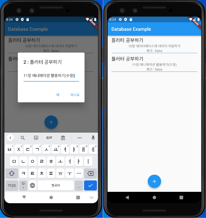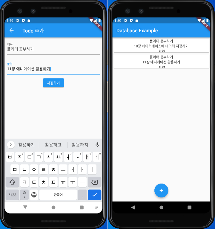 "조준수. (2021). Do it! 플러터 앱 프로그래밍. 이지스퍼블리싱", 10장을 실습하였다. 데이터베이스를 앱과 연동하는 방법이다. DBMS로는 SQLite를 사용하였다. sqflite 패키지를 이용해 Map 형태로 데이터를 CRUD 하는 방식과 query를 이용해 검색, 삭제, 수정하는 방식을 다루었다.