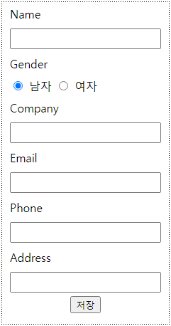 [그림 1] 최초 <!-- dom_create.html --> <head> <meta charset="UTF-8" /> <meta http-equiv="X-UA-Compatible" content="IE=edge" /> <meta name="viewport" content="width=device-width, initial-scale=1.0" /> <title>Document</title> <style> * { box-sizing: border-box; } .row { display: flex; flex-wrap: wrap; } .col-4 { flex: 33.3333%; padding: 5px; } .col-8 { flex: 66.6666%; padding: 5px; } input.form-control { width: 100%; padding: 5px 10px; } .text-center { text-align: center; } .alert { color: red; } /* 반응형 - 700px 이하이면 컴럼 요소 줄 바꿈 */ @media screen and (max-width: 700px) { .row { flex-direction: column; } } </style> </head> <body> <div class="row"> <div class="col-4"> <label for="name">Name</label> </div> <div class="col-8"> <input type="text" name="" id="name" class="form-control" /> </div> <div class="col-4"> <label for="name">Gender</label> </div> <div class="col-8"> <input type="radio" name="gender" id="male" value="male" checked /> <label for="male">남자</label> <input type="radio" name="gender" id="female" value="female" /> <label for="female">여자</label> </div> <div class="col-4"> <label for="company">Company</label> </div> <div class="col-8"> <input type="text" name="" id="company" class="form-control" /> </div> <div class="col-4"> <label for="email">Email</label> </div> <div class="col-8"> <input type="email" name="" id="email" class="form-control" /> </div> <div class="col-4"> <label for="phone">Phone</label> </div> <div class="col-8"> <input type="tel" name="" id="phone" class="form-control" /> </div> <div class="col-4"> <label for="address">Address</label> </div> <div class="col-8"> <input type="tel" name="" id="address" class="form-control" /> </div> </div> <div class="text-center"> <button onclick="doCreate();">저장</button> </div> <script> function doCreate() { const name = document.querySelector("#name").value; const gender = document.querySelector("[name=gender]:checked").value; const company = document.querySelector("#company").value; const email = document.querySelector("#email").value; const phone = document.querySelector("#phone").value; const address = document.querySelector("#address").value; console.log(name); console.log(gender); console.log(company); console.log(email); console.log(phone); console.log(address); } </script> </body>