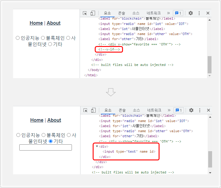 <template> <div> <input type="radio" name="" id="ai" v-model="favorite" value="AI" /> <label for="ai">인공지능</label> <input type="radio" name="" id="blockchain" v-model="favorite" value="BC" /> <label for="blockchain">블록체인</label> <input type="radio" name="" id="iot" v-model="favorite" value="IOT" /> <label for="iot">사물인터넷</label> <input type="radio" name="" id="other" v-model="favorite" value="OTH" /> <label for="other">기타</label> <div v-show="favorite === 'OTH'"> <!-- <div v-if="favorite === 'OTH'"> --> <input type="text" name="" id="" v-model="otherValue" /> </div> </div> </template> <script> export default { components: {}, data() { return { favorite: '', otherValue: '' } } } </script>