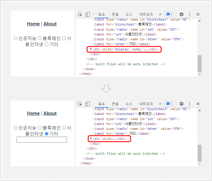 v-if는 [그림 2]와 같이 HTML DOM 요소를 생성/삭제한다. DOM 트리를 리페인팅하기 때문에 리소스를 많이 사용한다. 반면 v-show는 [그림 3]과 같이 style에서 보이기/감추기 처리를 한다. 개발자는 사용자의 UX를 항상 고려해야 한다. 이러한 태도는 코드를 개선하는 것보다 더 중요하다.