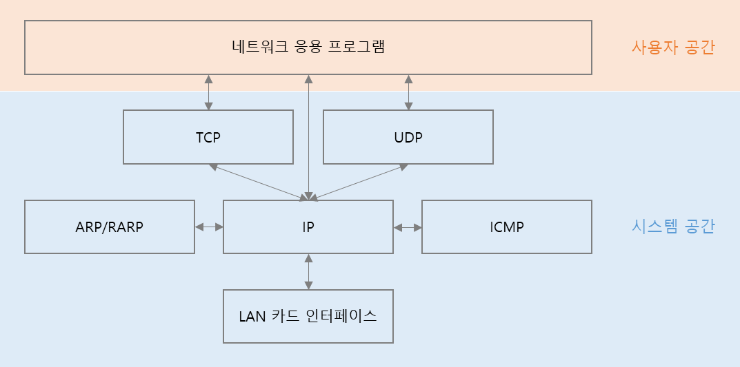 - LAN 카드 → 드라이버 → IP(패킷 경로 선택) → TCP(TCP 연결형, UDP 비연결형 서비스)