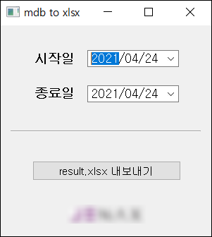 [그림1] 완성된 "dbm to xlsx" Microsoft Access의 dbm에서 원하는 기간에 해당하는 row를 xlsx파일로 내보내는 [그림1]과 같은 어플리케이션을 만들어 보았다.