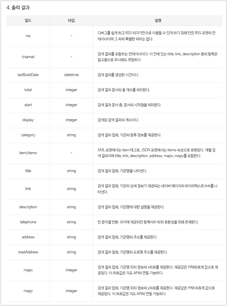 package com.example.restaurant.naver.dto; import java.util.List; import com.example.restaurant.naver.dto.SearchImageRes.SearchImageItem; import lombok.AllArgsConstructor; import lombok.Data; import lombok.NoArgsConstructor; @Data @NoArgsConstructor @AllArgsConstructor public class SearchLocalRes { private String lastBuildDate; private int total; private int start; private int display; private List<SearchLocalItem> items; @Data @NoArgsConstructor @AllArgsConstructor public static class SearchLocalItem{ private String category; // category 위치를 Item 하위로 옮겼다. private String title; private String link; private String description; private String telephone; private String address; private String roadAddress; private int mapx; private int mapy; } }※ 이상의 내용은 패스트 캠퍼스 Java & Spring-boot 과정을 통해 알게 된 내용이며 "네이버 지역 검색 API 문서"가 오해의 소지가 있어 보여 기록하였다.