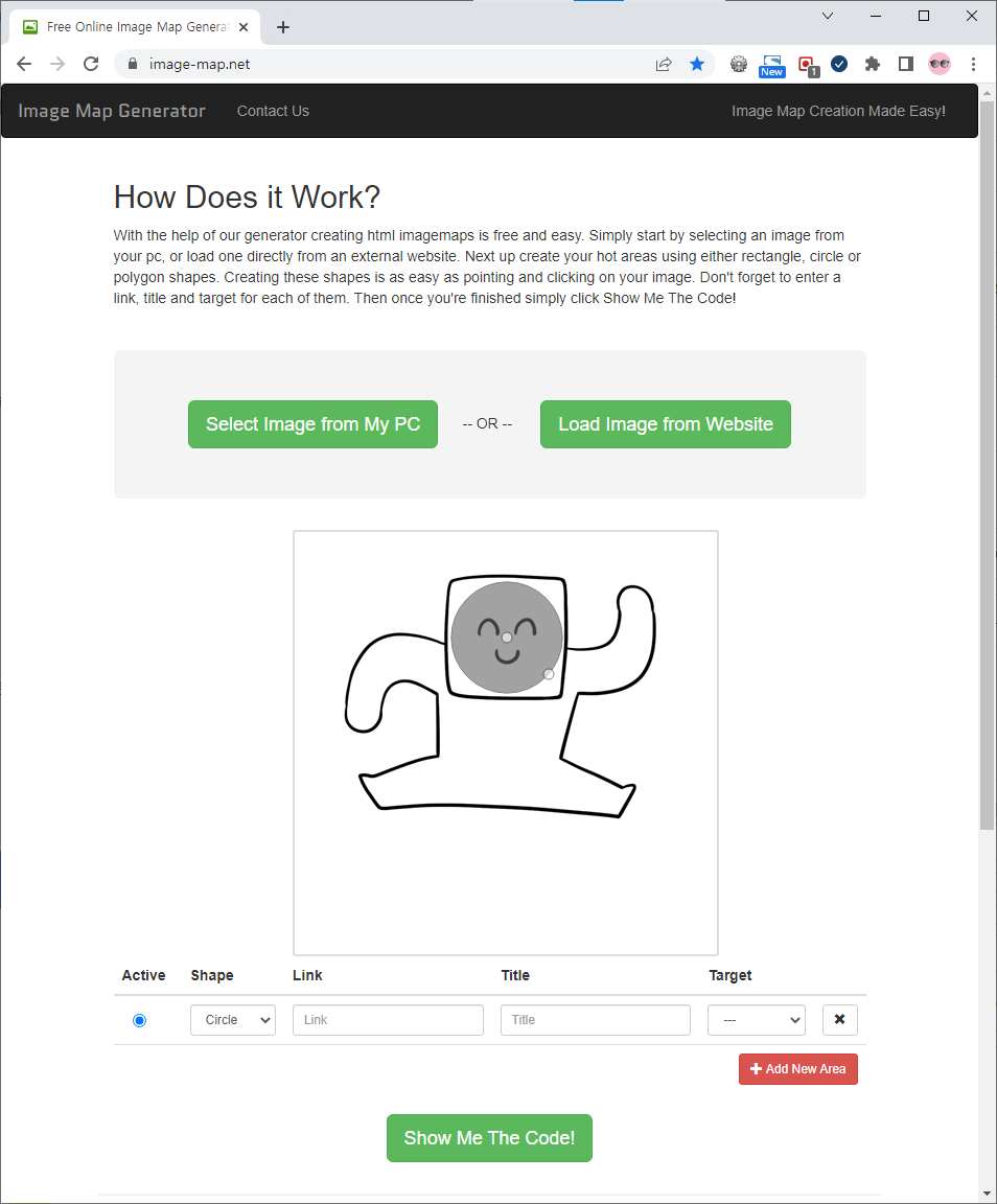 Image Map Generator 사이트에서 사용할 이미지를 업로드(Select Image from My PC) 한 후 해당 이미지의 부분만 설정해 주면 쉽게 선택에 부분의 좌표가 포함된 map 태그를 가져올 수 있다.
