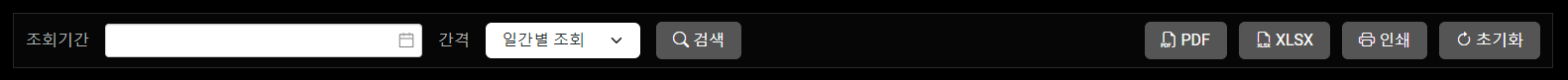 <div class="navbar navbar-expand-lg navbar-dark bg-dark"> <div class="container-fluid"> <div class="row g-3 align-items-center"> <div class="col-auto">조회기간</div> <div class="col-auto"> <date-picker v-model:value="time3" range></date-picker> </div> <div class="col-auto">간격</div> <div class="col-auto"> <select class="form-select me-2"> <option selected>일간별 조회</option> <option value="1">주간별 조회</option> <option value="2">월간별 조회</option> <option value="3">연도별 조회</option> </select> </div> <div class="col-auto"> <button class="btn btn-secondary my-sm-0" type="submit"> <i class="bi bi-search"></i> 검색 </button> </div> </div> <div class="row g-1 align-items-center"> <div class="col-auto"> <button class="btn btn-secondary me-2 my-sm-0" type="submit"> <i class="bi bi-filetype-pdf"></i> PDF </button> </div> <div class="col-auto"> <button class="btn btn-secondary me-2 my-sm-0" type="submit"> <i class="bi bi-filetype-xlsx"></i> XLSX </button> </div> <div class="col-auto"> <button class="btn btn-secondary me-2 my-sm-0" type="submit"> <i class="bi bi-printer"></i> 인쇄 </button> </div> <div class="col-auto"> <button class="btn btn-secondary my-sm-0" type="submit"> <i class="bi bi-arrow-clockwise"></i> 초기화 </button> </div> </div> </div> </div>참고한 내용