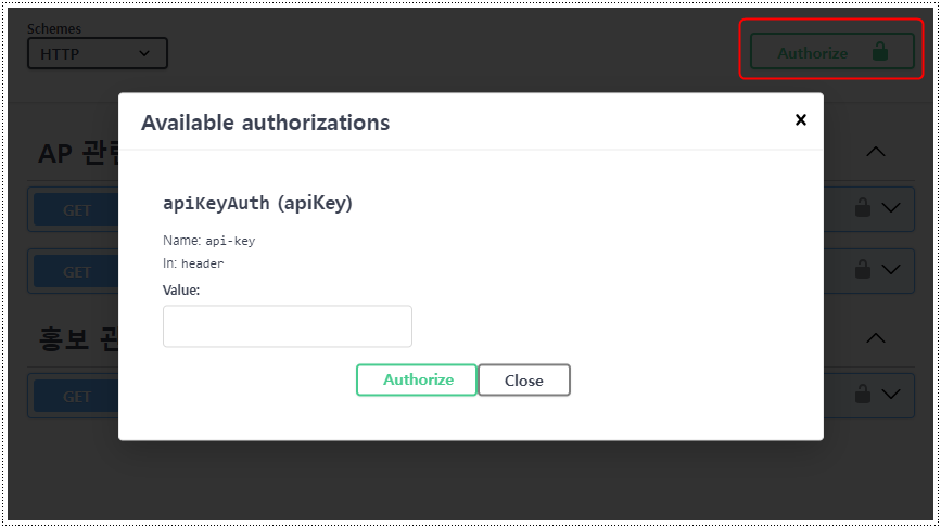 // routes/v1_promo.js import express from "express"; const router = express.Router(); import { queryPromo } from "../mysql/index.js"; import uuidAPIKey from "uuid-apikey"; // 추가 import { key } from "../app.js"; // 추가 // console.log(key) // 여기에서 호출하면 undefined. router.get() 메서드 내에서 호출해야 함 // #swagger.security를 추가해 주었다. router.get("/promo-list", async (req, res) => { /* #swagger.tags = ['홍보 관련'] #swagger.summary = '홍보 리스트 조회' #swagger.description = 'Client에서 홍보리스트를 요청하고, Server는 홍보리스트를 응답한다.' #swagger.path = "/promo/promo-list" #swagger.security = [{ "apiKeyAuth": [] }] */ try { // API 요청시 API 키를 header에 넣어 받도록 했다. let apikey = req.headers["api-key"]; // API 키를 검증하는 코드를 추가하였다. if ( !apikey || !uuidAPIKey.isAPIKey(apikey) || !uuidAPIKey.check(apikey, key.uuid) ) { res.status(401).send("API KEY가 유효하지 않습니다."); } else { const result = await queryPromo("promotions"); res.send(result); } } catch (e) { res.status(400).send("유효하지 않은 요청입니다."); } }); export { router };// swagger.js import swaggerAutogen from "swagger-autogen"; import * as dotenv from "dotenv"; dotenv.config(); const doc = { info: { title: "(생략)", description: "(생략)", }, host: "localhost:3000", basePath: `/api/${process.env.ROUTE_VERSION}`, // securityDefinitions을 추가해야 한다. securityDefinitions: { apiKeyAuth: { type: "apiKey", in: "header", name: "api-key", }, }, }; const outputFile = "./swagger-output.json"; const endpointsFiles = ["../app.js"]; const routes = ["./routes/v1_promo.js"]; swaggerAutogen(outputFile, routes, doc, endpointsFiles);위의 과정을 마치면 Swagger UI에서 API 키를 입력하는 [그림 1]과 같은 모달을 볼 수 있다. 모달은 "Authorize" 버튼을 클릭하면 된다. 개별 API에서도 API 키를 입력받는 input 창을 볼 수 있다. Available authorizations 모달에서 키를 한 번만 입력하면 개별 API에서 키를 입력할 필요 없이 모든 API 호출 테스트가 가능하다.