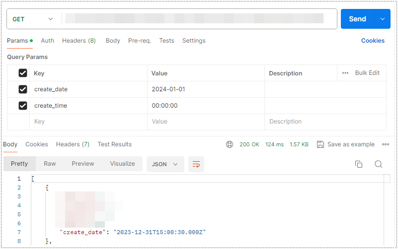 [그림 1] MySQL에서 날짜, 시간 정보로 조회 하지만 내가 만든 서버에 동일한 쿼리를 적용한 API를 호출하면 [그림 2]와 같이 UTC 시간으로 조회가 되었다.