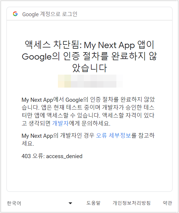 로그인 테스트 진행 중에 [그림 1]과 같은 에러가 발생한다면 Credentials > CREATE CREDENTIALS에서 테스트 사용자에 로그인 시도에 사용한 사용자 이메일 주소를 추가해 주어야 한다.