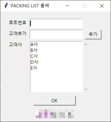 - tkinter 모듈로 GUI를 구현했다. 고객사 리스트는 customer.txt 파일에 저장되어 있다(현재는 추가만 되고 삭제는 txt 파일을 직접 수정해야 한다).