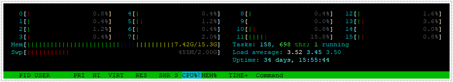[그림 1] htop 실행 화면 - 0~15는 CPU 코어수를 말한다.