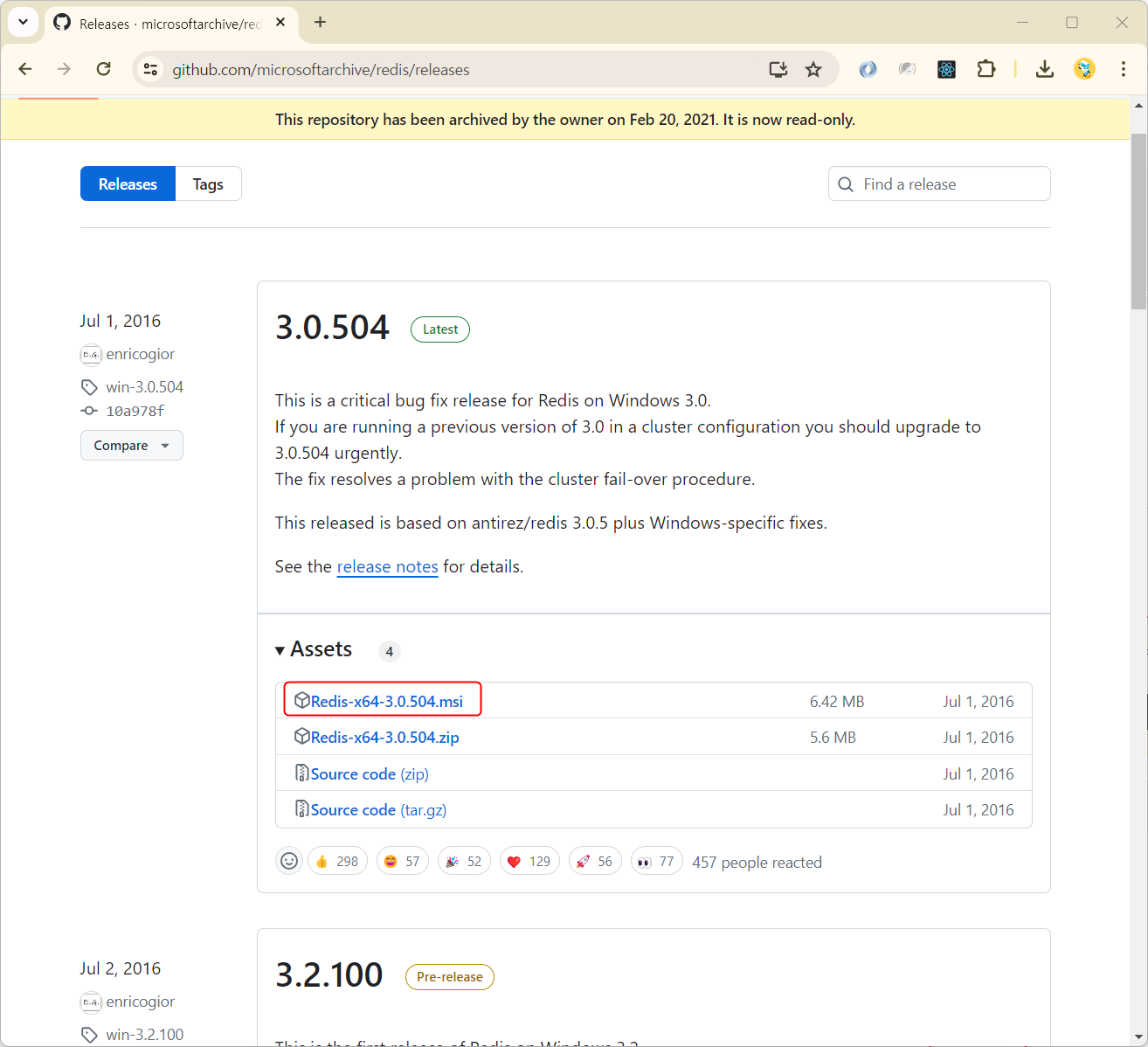 [그림 1]에서 Releases를 클릭하면 다운로드 가능한 파일 리스트를 확인할 수 있다. [그림 2]의 리스트에서 msi 파일을 다운로드 후 설치하면 된다.