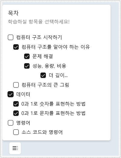 // PopoverIndex 컴포넌트 import { Button } from "@/components/ui/button"; import { Popover, PopoverContent, PopoverTrigger, } from "@/components/ui/popover"; import { TableOfContents } from "lucide-react"; import { CheckboxComponent } from "./CheckboxComponent"; import React, { useState } from "react"; // 카테고리 인터페이스 정의: 계층 구조로 이루어진 체크박스 항목의 구조를 정의 interface Category { id: string; // 카테고리의 고유 ID content: string; // 카테고리의 내용 checked: boolean; // 체크 여부 subcategory: Category[]; // 하위 카테고리 목록 } // 초기 카테고리 데이터: Popover 컴포넌트에서 사용할 기본 상태 const initailCategory: Category[] = [ { id: "1", content: "컴퓨터 구조 시작하기", checked: true, subcategory: [ { id: "4", content: "컴퓨터 구조를 알아야 하는 이유", checked: true, subcategory: [ { id: "9", checked: true, content: "문제 해결", subcategory: [], }, { id: "10", checked: true, content: "성능, 용량, 비용", subcategory: [ { id: "11", checked: false, content: "더 깊이...", subcategory: [], }, ], }, ], }, { id: "5", checked: true, content: "컴퓨터 구조의 큰 그림", subcategory: [], }, ], }, { id: "2", content: "데이터", checked: false, subcategory: [ { id: "6", checked: false, content: "0과 1로 숫자를 표현하는 방법", subcategory: [], }, { id: "7", checked: true, content: "0과 1로 문자를 표현하는 방법", subcategory: [], }, ], }, { id: "3", content: "명령어", checked: false, subcategory: [ { id: "8", checked: true, content: "소스 코드와 명령어", subcategory: [], }, ], }, ]; // PopoverIndex 컴포넌트: 학습 항목을 선택할 수 있는 팝업 UI export function PopoverIndex() { // 상태 관리: 현재 카테고리 데이터 상태 const [categoryObj, setCategoryObj] = useState(initailCategory); // 체크박스 상태를 토글하는 재귀 함수 const toggleChecked = (category: Category, isChecked: boolean): Category => { return { ...category, // 현재 카테고리 정보 복사 checked: isChecked, // 체크 상태 업데이트 subcategory: category.subcategory?.map((sub) => toggleChecked(sub, isChecked) // 하위 카테고리에도 재귀적으로 동일한 상태 적용 ), }; }; // 특정 ID를 가진 카테고리의 체크 상태를 변경 const handleCheckbox = (id: string) => { const toggleCategoryChecked = (categories: Category[]): Category[] => { return categories.map((category: Category) => { if (category.id === id) { // 해당 ID의 카테고리 체크 상태를 토글 return toggleChecked(category, !category.checked); } return { ...category, // 현재 카테고리 복사 subcategory: category.subcategory ? toggleCategoryChecked(category.subcategory) // 하위 카테고리에도 재귀적으로 적용 : category.subcategory, }; }); }; // 상태 업데이트 setCategoryObj((prev) => toggleCategoryChecked(prev)); }; // JSX 렌더링 return ( <div onClick={(e) => e.stopPropagation() /* 이벤트 버블링 방지 */}> <Popover> {/* 팝오버 트리거 버튼 */} <PopoverTrigger asChild> <Button asChild={true} variant="outline" size="icon" className="p-2"> <TableOfContents /> </Button> </PopoverTrigger> {/* 팝오버 내용 */} <PopoverContent className="w-80"> <div className="grid gap-4"> <div className="space-y-2"> <h4 className="font-medium leading-none">목차</h4> <p className="text-sm text-muted-foreground"> 학습하실 항목을 선택하세요! </p> </div> <div className=""> {/* 카테고리 렌더링 */} {categoryObj.map((category) => { // 재귀적으로 카테고리와 하위 항목 렌더링 const renderCategory = ( category: Category, depth: number = 0 // 들여쓰기 깊이 ) => { return ( <div key={category.id} // 고유 키 style={ { paddingLeft: `${depth}rem`, // 들여쓰기 스타일 } as React.CSSProperties } onClick={(e) => { e.stopPropagation(); // 이벤트 버블링 방지 handleCheckbox(category.id); // 체크박스 상태 변경 }} > {/* 체크박스 컴포넌트 */} <CheckboxComponent id={category.id} content={category.content} checked={category.checked} /> {category.subcategory && category.subcategory.map((sub) => renderCategory(sub, depth + 1) // 하위 카테고리 렌더링 )} </div> ); }; return renderCategory(category); // 최상위 카테고리 렌더링 })} </div> </div> </PopoverContent> </Popover> </div> ); }// CheckboxComponent 컴포넌트 import { Checkbox } from "@/components/ui/checkbox"; interface CheckboxComponentProps { id: string; content: string; checked: boolean; } export function CheckboxComponent({ id, content, checked, }: CheckboxComponentProps) { return ( <div className="flex items-center mt-3 space-x-2"> <Checkbox id={id} checked={checked} /> <label htmlFor={id} className="text-sm font-medium leading-none peer-disabled:cursor-not-allowed peer-disabled:opacity-70" onClick={() => document.getElementById(id)?.click()} > {content} </label> </div> ); }