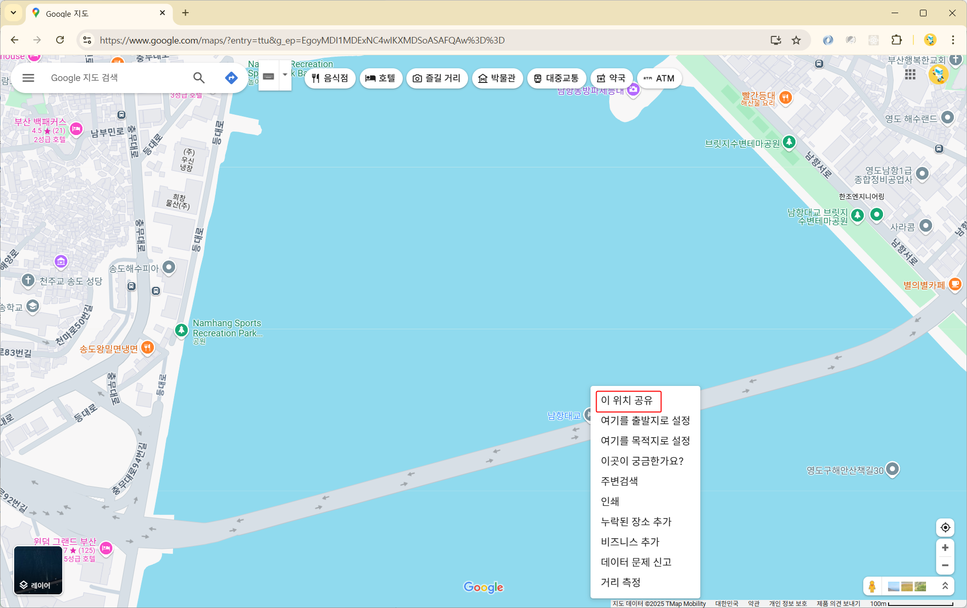 [그림 3] 위경도 정보를 확인하고자 하는 포인트 "마우스 우크릭" 후 "이 위치 공유" 클릭