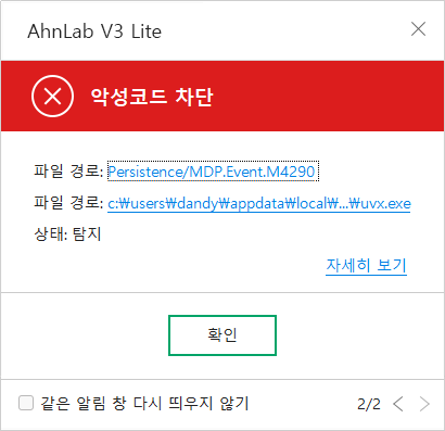 pip install uv방법을 사용하거나, V3 백신 설정에서 해당 스크립트나 파일 경로를 예외 처리하는 것을 권장한다.4.