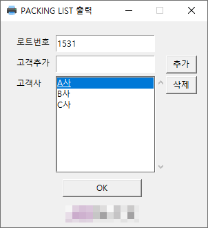 - tkinter 모듈(delete(0,"end"))을 이용해서 패킹리스트 출력 또는 고객사 추가 후 텍스트 입력창이 초기화 되도록 하였다. delete(0,"end")은 텍스트 입력창 내의 모든 내용을 지운다.