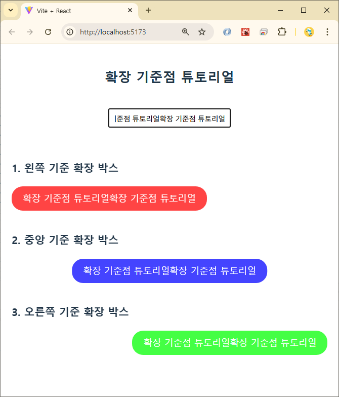 import { useState } from "react"; function CenterExpandTutorial() { const [text, setText] = useState("확장 기준점 튜토리얼"); return ( <div style={{ padding: "20px", display: "flex", flexDirection: "column", gap: "20px", alignItems: "center", }} > <h2>확장 기준점 튜토리얼</h2> {/* 입력 필드 */} <input type="text" value={text} onChange={(e) => setText(e.target.value)} style={{ padding: "8px", width: "200px", marginBottom: "20px", }} /> {/* 왼쪽 기준 확장 박스 */} <div style={{ width: "100%" }}> <h3>1. 왼쪽 기준 확장 박스</h3> <div style={{ backgroundColor: "#ff4444", color: "white", padding: "10px 20px", borderRadius: "20px", display: "inline-block", minWidth: "100px", margin: "0 auto", textAlign: "center", whiteSpace: "nowrap", }} > {text} </div> </div> {/* 중앙 기준 확장 박스 */} <div style={{ width: "100%" }}> <h3>2. 중앙 기준 확장 박스</h3> <div style={{ position: "relative", display: "flex", justifyContent: "center", width: "100%", }} > <div style={{ backgroundColor: "#4444ff", color: "white", padding: "10px 20px", borderRadius: "20px", display: "inline-block", minWidth: "100px", position: "absolute", left: "50%", transform: "translateX(-50%)", textAlign: "center", whiteSpace: "nowrap", }} > {text} </div> </div> </div> <br /> {/* 오른쪽 기준 확장 박스 */} <div style={{ width: "100%" }}> <h3>3. 오른쪽 기준 확장 박스</h3> <div style={{ position: "relative", display: "flex", justifyContent: "flex-end", width: "100%", }} > <div style={{ backgroundColor: "#44ff44", color: "white", padding: "10px 20px", borderRadius: "20px", display: "inline-block", minWidth: "100px", textAlign: "center", whiteSpace: "nowrap", }} > {text} </div> </div> </div> </div> ); } export default CenterExpandTutorial;5. 주의사항