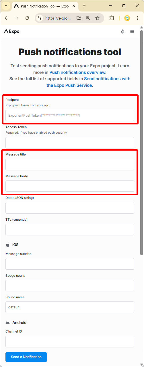 백엔드 서버 없이 [그림 2]와 같은 https://expo.dev/notifications에서 테스트 해볼 수 있다.