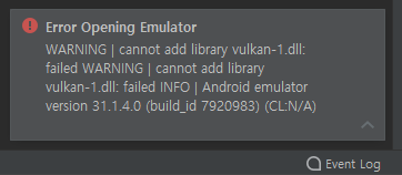 vulkan-1.dll 관련 에러 AVD 매니저에서 가상 디바이스를 생성하였고, 검색 및 선택도 된다. 하지만 실행 시 위와 같은 에러가 발생하였다. vulkan-1.dll과 관련되어있다. 이 문제는 다음과 같은 방법으로 간단히 해결할 수 있다.