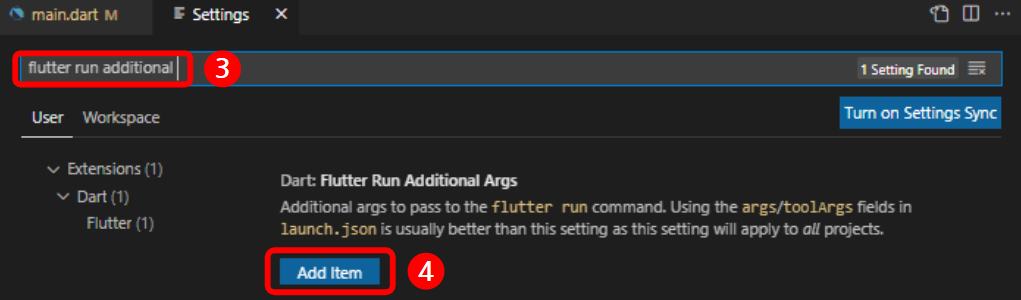 → Flutter Run Additional Args 검색 → Add Item VS Code에서는 Manage → Settings → "Flutter Run Additional Args" 검색 → Add Item 클릭 후 아래의 내용을 추가하면 해결된다.